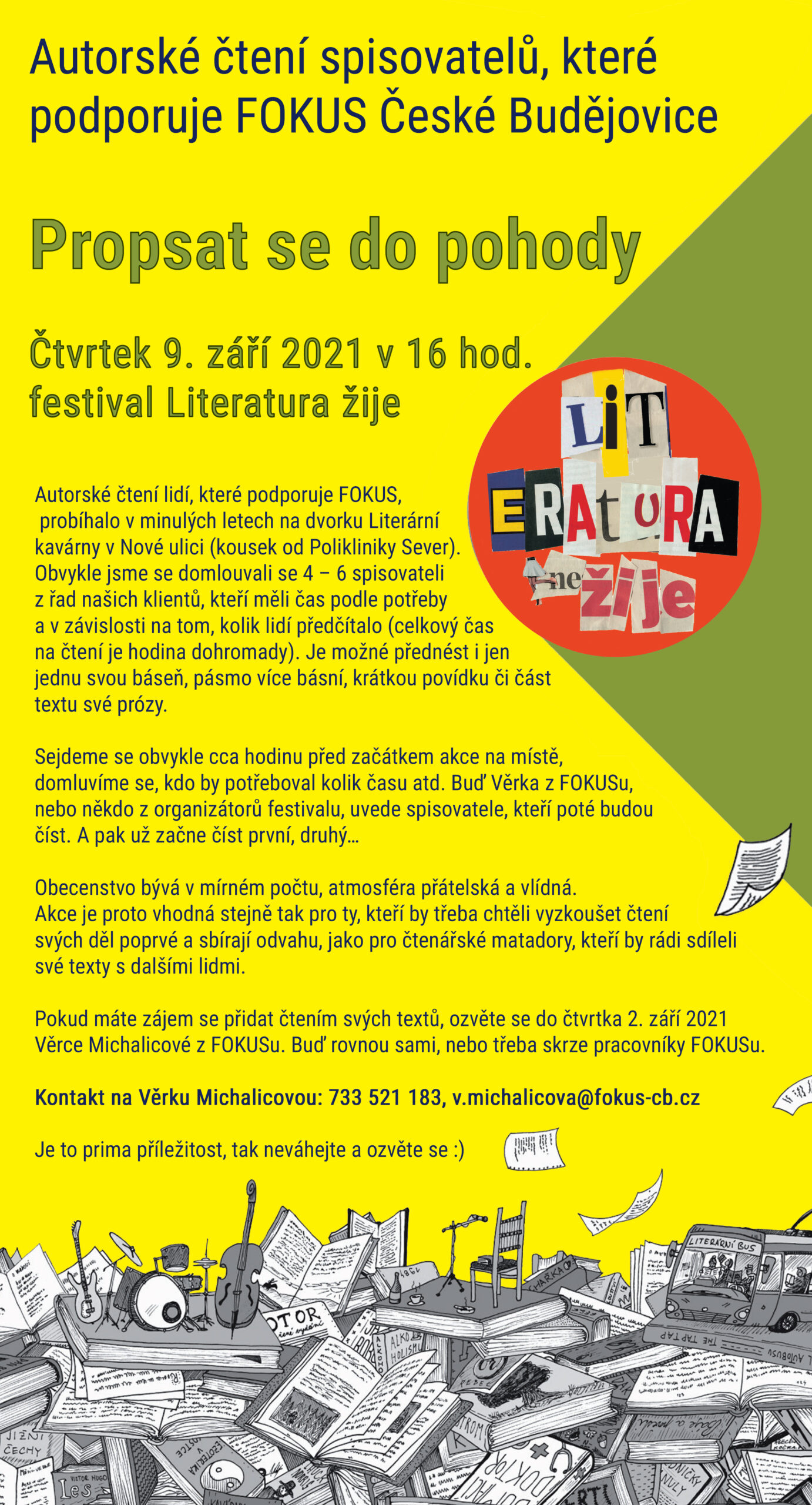 Ve čtvrtek 9. září 2021 bude od 16 hodin součástí festivalu Literatura žije autorské čtení literárních děl lidí, které podporuje FOKUS České Budějovice. Skládáte básně či píšete prózu a jste naším klientem? Rádi se s Vámi domluvíme a můžete se též zúčastnit.