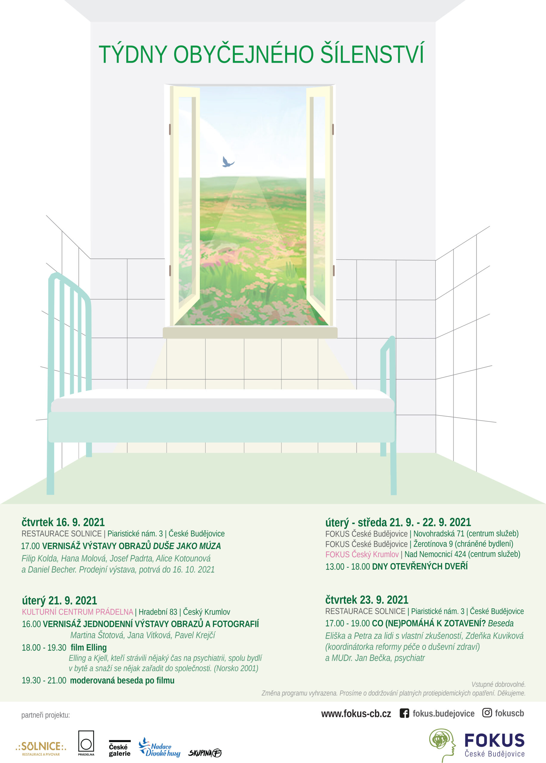 Po roční pauze jsou tu akce na podporu lidí s duševním onemocněním. Výstavy obrazů a fotografií, promítání filmu, besedy o duševním zdraví, dny otevřených dveří. Přijďte a zažijte s námi Týdny obyčejného šílenství.